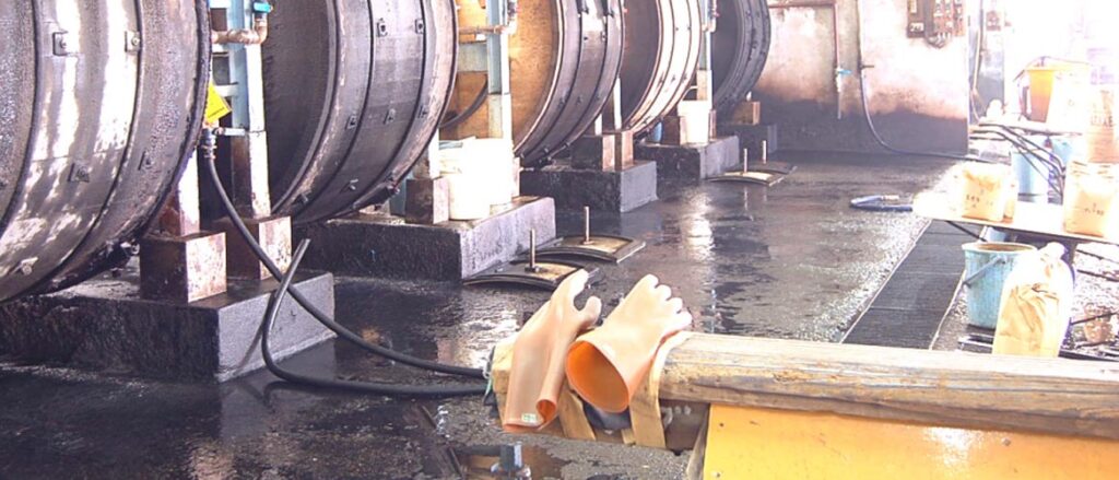 ドラムやハイドプロセッサーという機械に皮となめし液を入れ、6~8時間回転し、一日かけて鞣します。